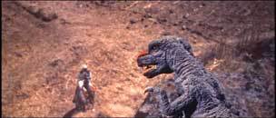There is nothing new here, but the characters move about their business until the allosaurus arrives, right around at the one-hour mark. Then the dinosaur kills one of the main characters, scoops him up into this animated mouth, and as Ray Harryhausen often did, both man and dinosaur are animated. With Ray, you probably wouldn't notice unless someone told you. In this movie, well, you can definitely tell they're animated.