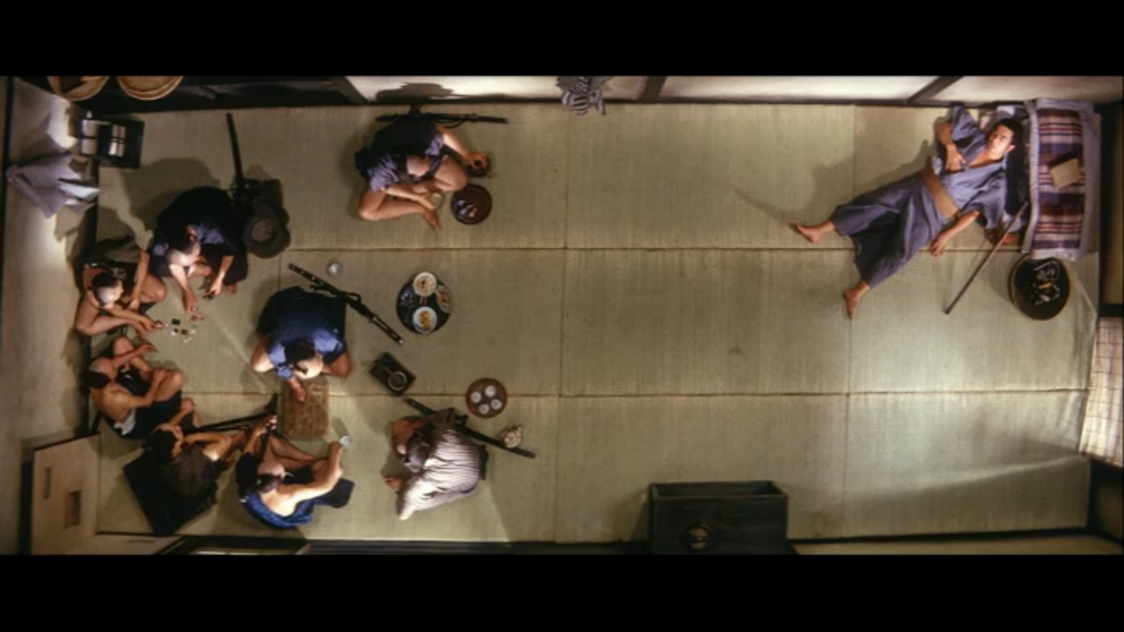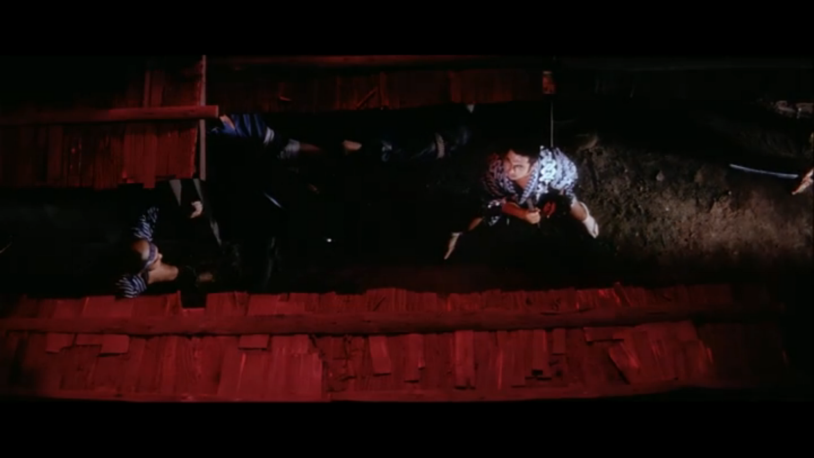 A striking downshot, reds echoing carnage about to come, as Zatoichi is trapped with the visual confines of the shot, the locale and the action.
