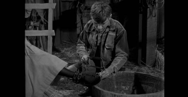 Sugarfoot rides into immediate danger, with Rex Reason holding a pitchfork to his throat, believing Tom is a tax collector come to drive him and his young sons off their farm.